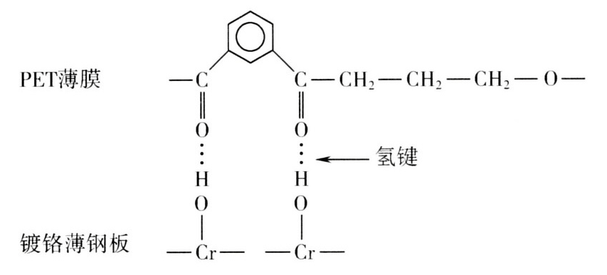关于覆膜铁膜与基板的附着力机理,至今多数学者仍认同Tanaka 等提出的PET中C=0的O与TFS 表面-OH的H结合成氢键的分子力观点,其结如图3所示。