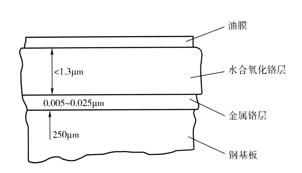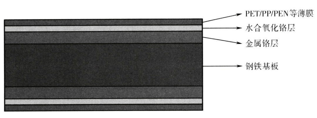 众所周知,镀锡板以其优异耐蚀性能和独特外观,成为食品饮料罐用材料的首选。随着食品饮料市场规模的大幅度增长,镀锡板的用量也相应增大,市场一度出现供不应求的局面,导致镀锡板价格的持续上涨。与此同时,也加速了稀缺昂贵资源锡的消耗,为了降低成本和节约有限的锡资源,科研工作者们加大了对镀铬板的研发和应用。镀铬板在成本方面较镀锡板有明显优势,且具有较好的表面附着力,但镀铬层的硬、脆问题一直制约着镀铬板在深冲罐领域中的应用。而覆膜铁材料的独特结构正好弥补了其先天缺陷,可被应用于各种金属罐领域。镀铬板材料一般由钢基板层、金属铬层、水合氧化铬层和油膜层组成,如图1所示。